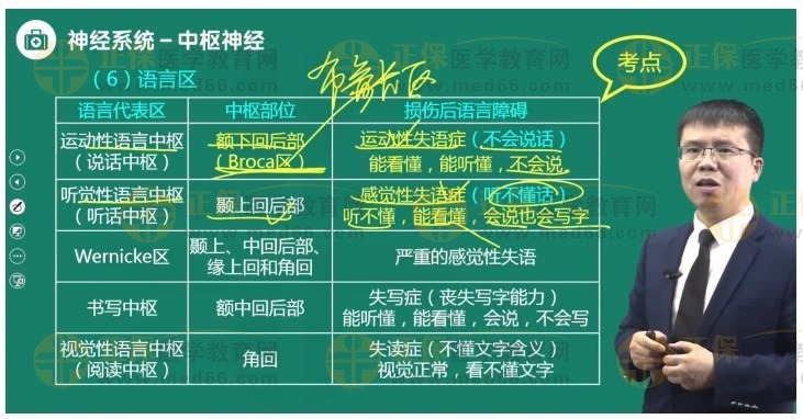 若中央前回底部之前的布洛卡三角區(qū)受損,病人可以看懂文字與聽懂別人的談話,但自己不會說話,不能用語詞來口頭表達自己的思想;然而,其發(fā)音有關的肌肉并不麻痹。課程回顧:2023臨床執(zhí)業(yè)醫(yī)師考試輔導課程-基礎學習班-第十一章-神經(jīng)系統(tǒng)-第03講