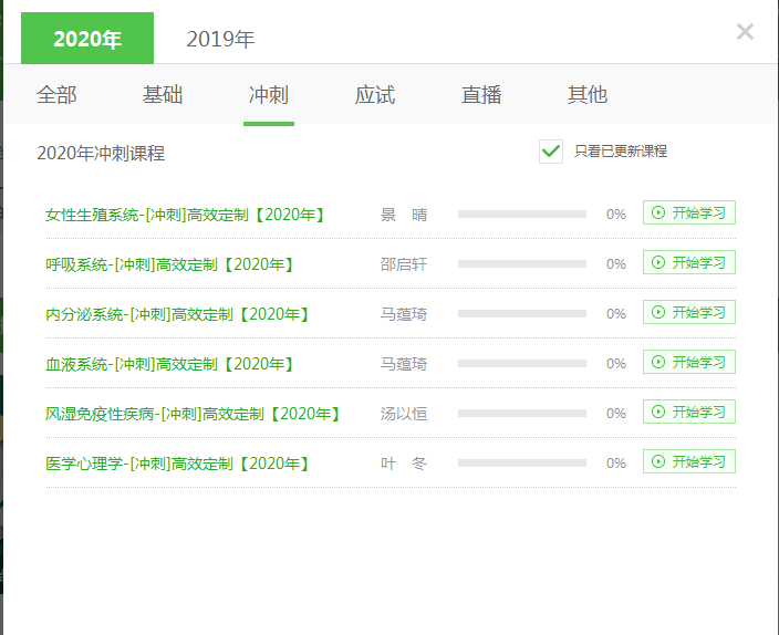 考生注意!2020年臨床執(zhí)業(yè)醫(yī)師沖刺精講班的課程已經(jīng)陸續(xù)開通啦!