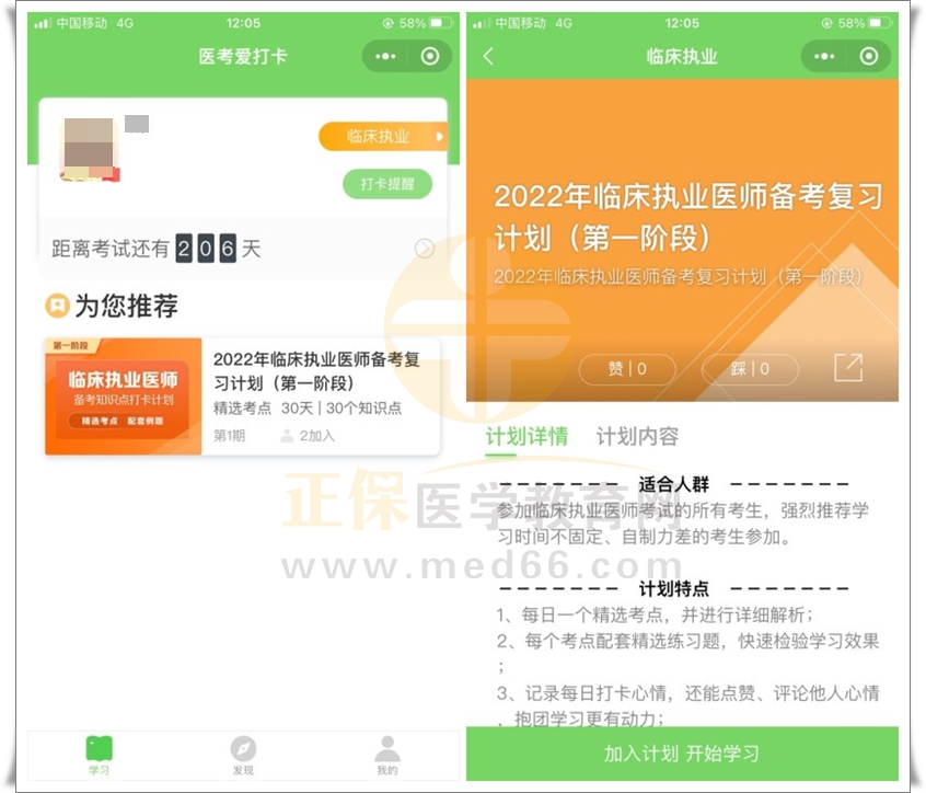第三步:選擇備考科目后即進(jìn)入學(xué)習(xí)計(jì)劃選擇的頁(yè)面,請(qǐng)選擇“您的備考計(jì)劃”,如臨床執(zhí)業(yè)醫(yī)師備考復(fù)習(xí)計(jì)劃(第一階段),然后點(diǎn)擊下方“加入計(jì)劃 開始學(xué)習(xí)”按鈕,開始正式進(jìn)入打卡學(xué)習(xí)。
