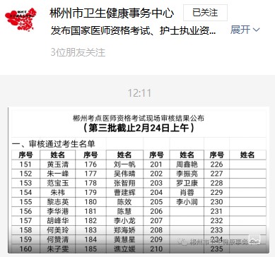 郴州考點(diǎn)微信公眾號三次公布現(xiàn)場審核結(jié)果合格人員名單,審核通過的考生到審核現(xiàn)場簽字確認(rèn)后視為醫(yī)師資格考試報名成功。
