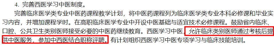 完善臨床醫(yī)學(xué)類專業(yè)中醫(yī)藥課程教學(xué)計(jì)劃,將中醫(yī)藥課程列為臨床醫(yī)學(xué)類專業(yè)本科必修課和畢業(yè)實(shí)習(xí)內(nèi)容,并增加課程學(xué)時(shí)。在高職臨床醫(yī)學(xué)專業(yè)中開設(shè)中醫(yī)基礎(chǔ)與適宜技術(shù)必修課程。鼓勵(lì)省內(nèi)臨床、口腔、公共衛(wèi)生類別醫(yī)師接受必要的中醫(yī)藥繼續(xù)教育。西醫(yī)學(xué)習(xí)中醫(yī),允許臨床類別醫(yī)師通過考核后提供中醫(yī)服務(wù),參加中西醫(yī)結(jié)合職稱評聘。有計(jì)劃組織西醫(yī)學(xué)習(xí)中醫(yī)專項(xiàng)學(xué)習(xí)與臨床技能培訓(xùn)。