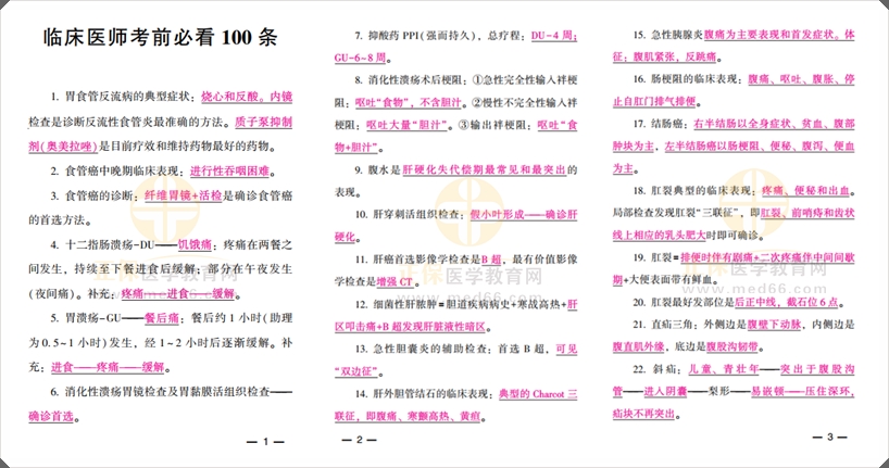 醫(yī)學(xué)教育網(wǎng)的老師們整理醫(yī)師筆試【考前爆料100點(diǎn)】,總結(jié)精編考點(diǎn),考前沖刺記憶上分必備,提高你的沖刺備考能力!