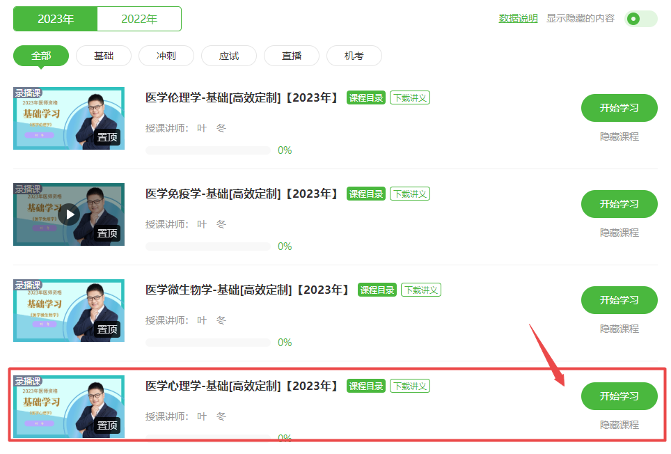2023年醫(yī)師備考全面開啟!2023年臨床執(zhí)業(yè)醫(yī)師基礎(chǔ)學(xué)習(xí)新課開通!目前由葉冬老師授課的《醫(yī)學(xué)心理學(xué)》科目課程已更新!已購課同學(xué)可以直接進(jìn)入我的網(wǎng)校我的家-我的課程-醫(yī)學(xué)心理學(xué)科目進(jìn)行學(xué)習(xí)!關(guān)于2023年臨床執(zhí)業(yè)醫(yī)師《醫(yī)學(xué)心理學(xué)》考試大綱/教材變動的相關(guān)內(nèi)容,具體內(nèi)容下方查看。未購課學(xué)員點(diǎn)擊此處進(jìn)入選擇課程>>,具體看課位置如下: