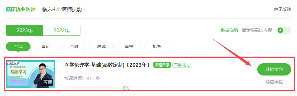 2023年醫(yī)師備考全面開(kāi)啟!2023年臨床執(zhí)業(yè)醫(yī)師基礎(chǔ)學(xué)習(xí)新課開(kāi)通!目前由葉冬老師授課的《醫(yī)學(xué)倫理學(xué)》科目課程已更新!已購(gòu)課同學(xué)可以直接進(jìn)入我的網(wǎng)校我的家-我的課程-醫(yī)學(xué)倫理學(xué)科目進(jìn)行學(xué)習(xí)!關(guān)于2023年臨床執(zhí)業(yè)醫(yī)師《醫(yī)學(xué)倫理學(xué)》考試大綱/教材變動(dòng)的相關(guān)內(nèi)容,具體內(nèi)容下方查看。未購(gòu)課學(xué)員點(diǎn)擊此處進(jìn)入選擇課程>>,具體看課位置如下: