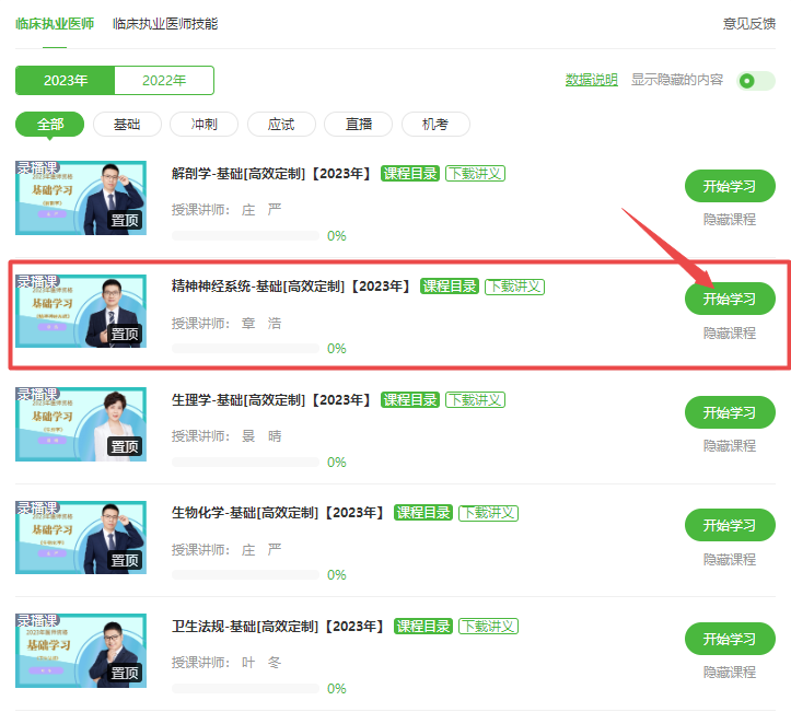 2023年醫(yī)師備考全面開(kāi)啟!2023年臨床執(zhí)業(yè)醫(yī)師基礎(chǔ)學(xué)習(xí)新課開(kāi)通!目前由章浩老師授課的《精神神經(jīng)系統(tǒng)》科目課程已更新!已購(gòu)課同學(xué)可以直接進(jìn)入我的網(wǎng)校我的家-我的課程-精神神經(jīng)系統(tǒng)科目進(jìn)行學(xué)習(xí)!關(guān)于2023年臨床執(zhí)業(yè)醫(yī)師《精神神經(jīng)系統(tǒng)》考試大綱/教材變動(dòng)的相關(guān)內(nèi)容,具體內(nèi)容下方查看。未購(gòu)課學(xué)員點(diǎn)擊此處進(jìn)入選擇課程>>,具體看課位置如下: