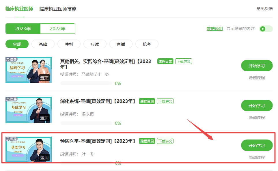 2023年醫(yī)師備考全面開啟!2023年臨床執(zhí)業(yè)醫(yī)師基礎(chǔ)學習新課開通!目前由葉冬老師授課的《預防醫(yī)學》科目課程已更新!已購課同學可以直接進入我的網(wǎng)校我的家-我的課程-預防醫(yī)學科目進行學習!關(guān)于2023年臨床執(zhí)業(yè)醫(yī)師《預防醫(yī)學》考試大綱/教材變動的相關(guān)內(nèi)容,具體內(nèi)容下方查看。未購課學員點擊此處進入選擇課程>>,具體看課位置如下: