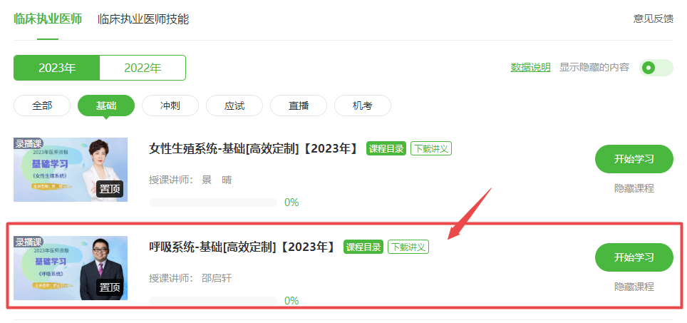 登錄學員代碼進入我的網校我的家,點擊“我的課程”,進入課程,選擇“2023年”,即可看到《呼吸系統(tǒng)》課程,點擊開始學習即可。