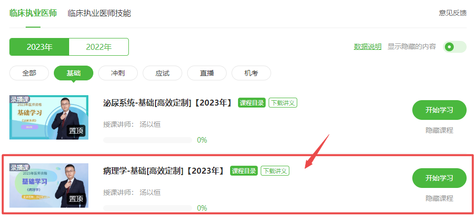 2023年醫(yī)師備考全面開啟!2023年臨床執(zhí)業(yè)醫(yī)師基礎(chǔ)學(xué)習(xí)新課開通!目前由湯以恒老師授課的《病理學(xué)》科目課程已更新!已購課同學(xué)可以直接進(jìn)入我的網(wǎng)校我的家-我的課程-病理學(xué)科目進(jìn)行學(xué)習(xí)!關(guān)于2023年臨床執(zhí)業(yè)醫(yī)師《病理學(xué)》考試大綱/教材變動的相關(guān)內(nèi)容,具體內(nèi)容下方查看。未購課學(xué)員點擊此處進(jìn)入選擇課程>>,具體看課位置如下: