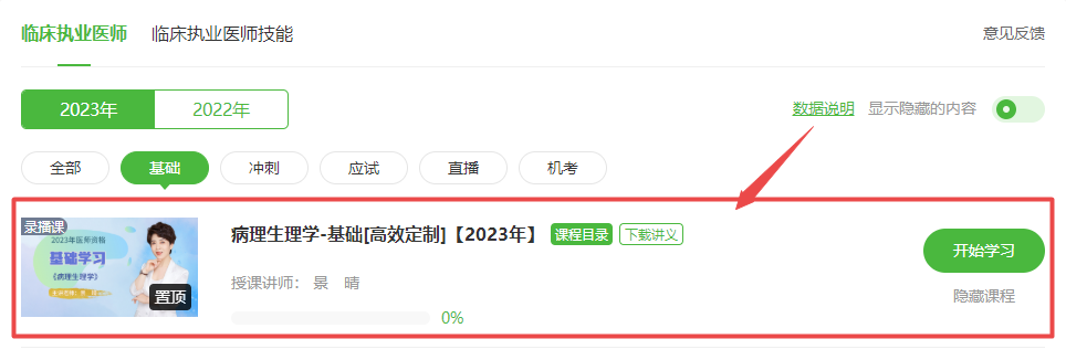 2023年醫(yī)師備考全面開啟!2023年臨床執(zhí)業(yè)醫(yī)師基礎(chǔ)學(xué)習(xí)新課開通!目前由景晴老師授課的《病理生理學(xué)》科目課程已更新!已購(gòu)課同學(xué)可以直接進(jìn)入我的網(wǎng)校我的家-我的課程-病理生理學(xué)科目進(jìn)行學(xué)習(xí)!關(guān)于2023年臨床執(zhí)業(yè)醫(yī)師《病理生理學(xué)》考試大綱/教材變動(dòng)的相關(guān)內(nèi)容,具體內(nèi)容下方查看。未購(gòu)課學(xué)員點(diǎn)擊此處進(jìn)入選擇課程>>,具體看課位置如下: