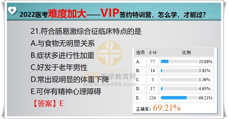 臨床執(zhí)業(yè)醫(yī)師VIP??迹悍夏c易激綜合征臨床特點(diǎn)的是?2022年臨床執(zhí)業(yè)醫(yī)師考試難度加大,出題方式跟往年不同,只看書本知識(shí),已經(jīng)很難應(yīng)對(duì)即將來臨的醫(yī)師資格考試,醫(yī)學(xué)教育網(wǎng)編輯為您整理VIP公開課題目如下,供大家參考學(xué)習(xí)。查看VIP課程>>