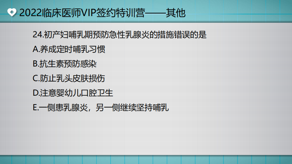 初產婦哺乳期預防急性乳腺炎的措施錯誤的是?湯以恒老師將為大家講解《其他》章節(jié)考試重點,這也是VIP簽約特訓營強化階段的最后2節(jié)課了,直播課免費公開(直播回放入口>>)!快來搶先做題吧!