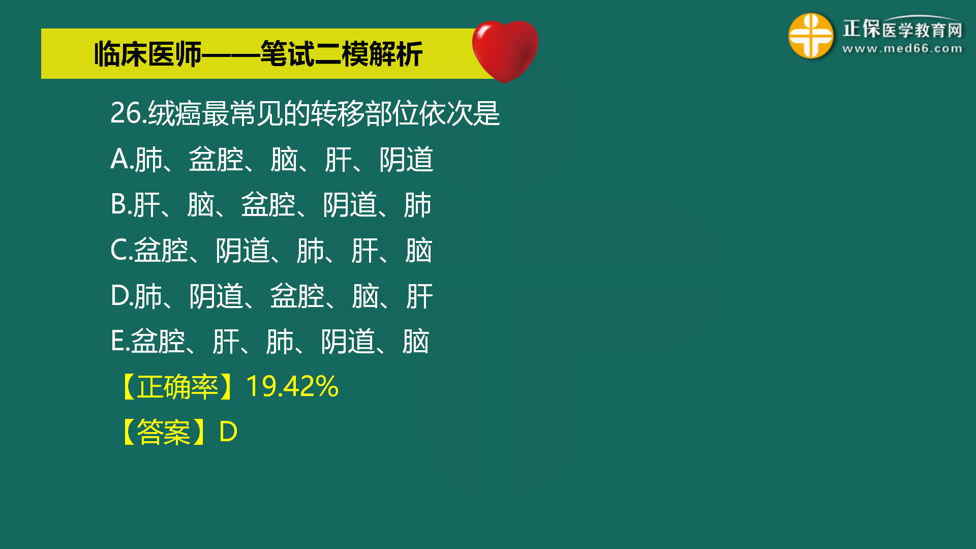 【正確率19.42%】絨癌最常見的轉(zhuǎn)移部位依次是:肺、陰道、盆腔、腦、肝。全國2022年臨床執(zhí)業(yè)醫(yī)師??嫉诙拙砣肟诔掷m(xù)開放中(查看詳情>>),醫(yī)學(xué)教育網(wǎng)編輯整理分享疑難易錯題有關(guān)內(nèi)容如下: