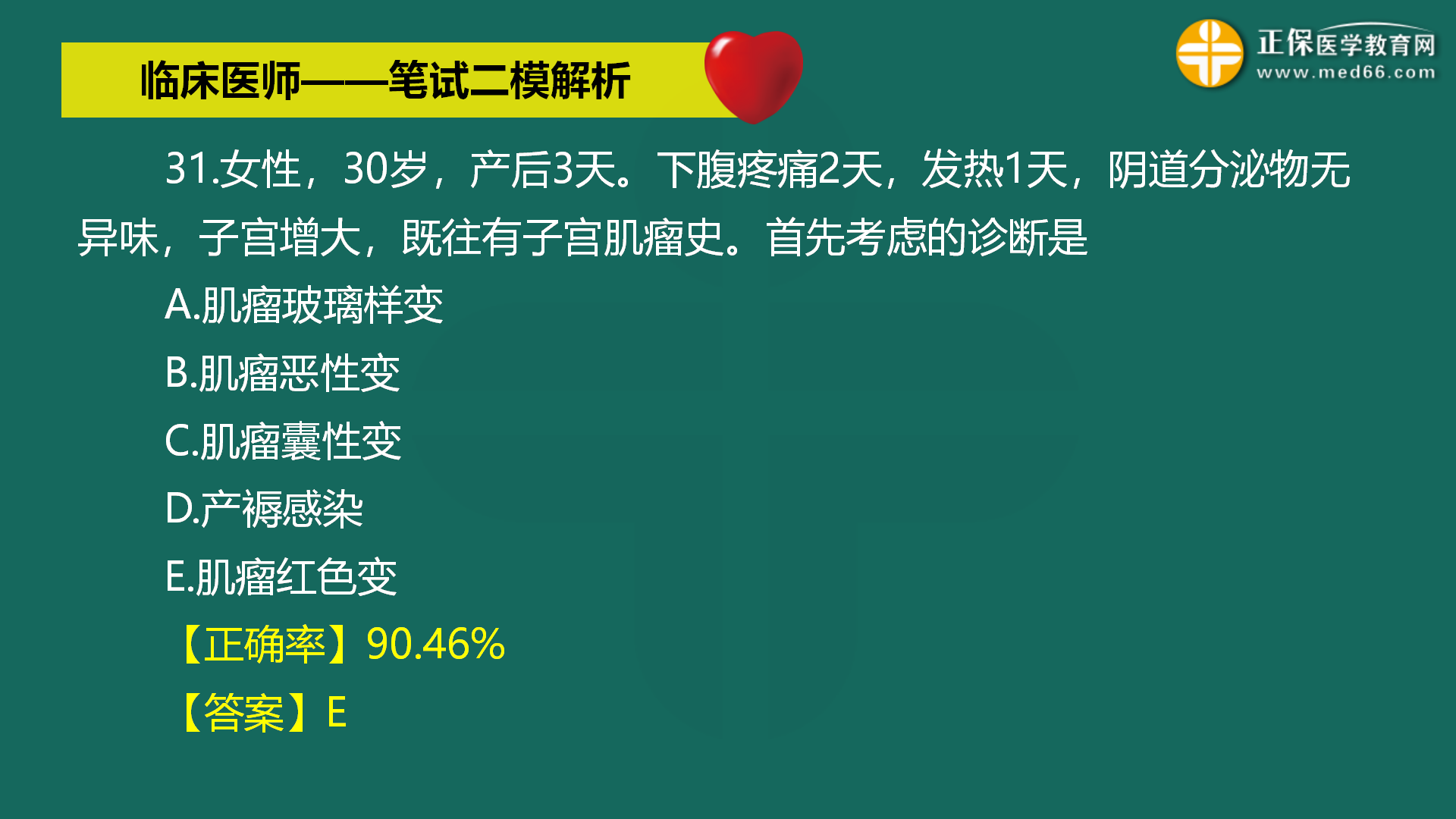 【肌瘤紅色變】女性,30歲,產(chǎn)后3天。下腹疼痛2天,發(fā)熱1天...全國2022年臨床執(zhí)業(yè)醫(yī)師??嫉诙拙砣肟诔掷m(xù)開放中(查看詳情>>),醫(yī)學(xué)教育網(wǎng)編輯整理分享疑難易錯題有關(guān)內(nèi)容如下: