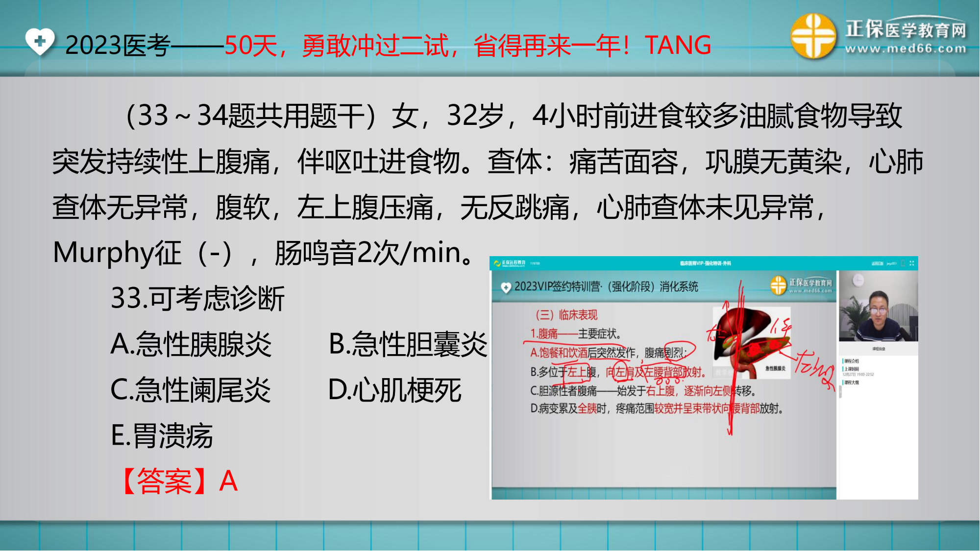 (33~34題共用題干)女,32歲,4小時前進食較多油膩食物導(dǎo)致突發(fā)持續(xù)性上腹痛,伴嘔吐進食物。查體:痛苦面容,鞏膜無黃染,心肺查體無異常,腹軟,左上腹壓痛,無反跳痛,心肺查體未見異常,Murphy征(-),腸鳴音2次/min。
