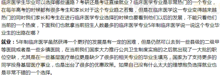 以上這些就是5年制臨床醫(yī)學(xué)本科專業(yè)在畢業(yè)以后面臨的幾條出路,對于我們同學(xué)來說需要根據(jù)自身的實際情況來進行選擇,因為這畢竟關(guān)乎到自己以后的發(fā)展,一招不慎可能會全盤皆輸,影響到自己以后甚至更長遠的一個發(fā)展,所以需要我們在選擇前做好深刻了解與認識,最后也希望大家在醫(yī)學(xué)的這條道路上也能越走越遠,獲得一個更好的發(fā)展!