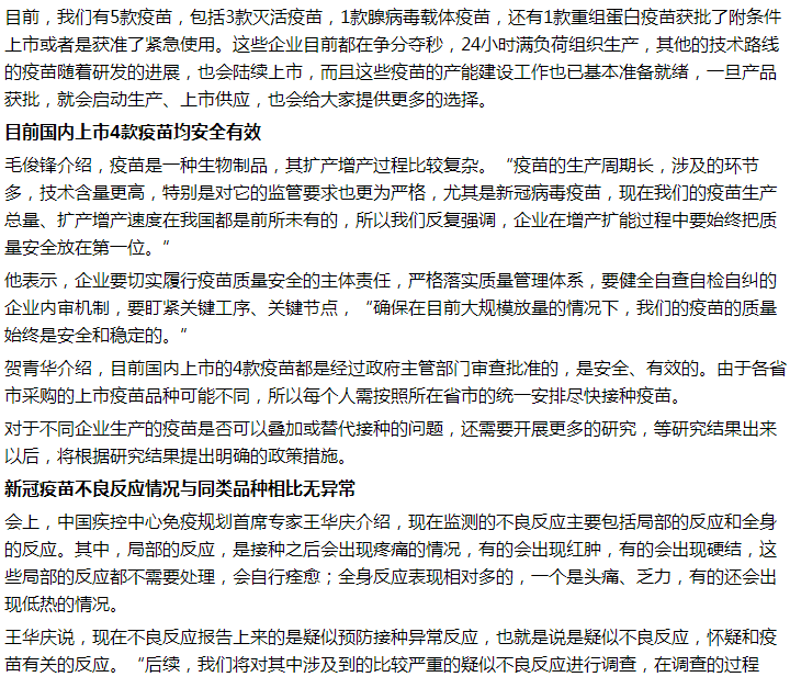王華慶介紹,不管是從臨床試驗研究的結(jié)果還是緊急使用的研究結(jié)果、上市后監(jiān)測的結(jié)果來看,新冠疫苗的不良反應(yīng)發(fā)生情況和既往已用的上市疫苗同類品種相比,結(jié)果是類似的,沒有出現(xiàn)異常的情況。