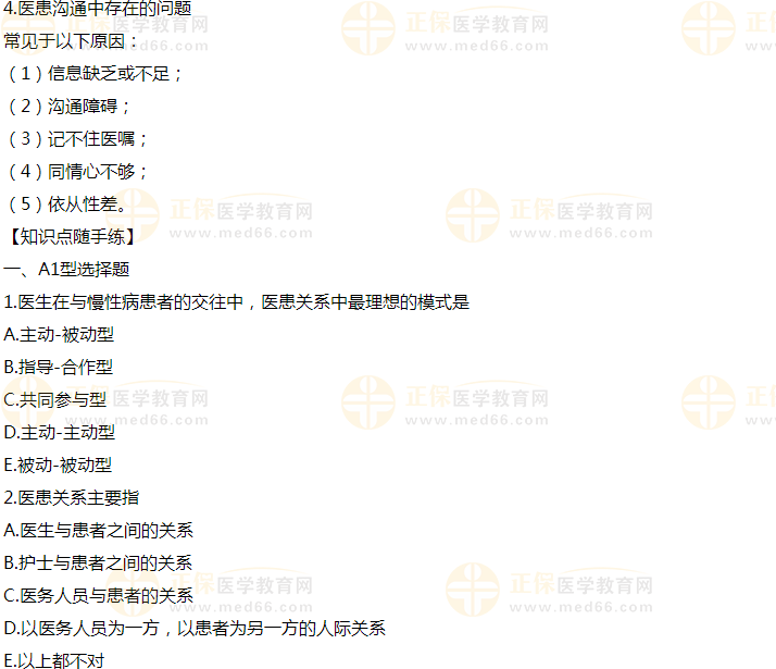 該內(nèi)容的重點是醫(yī)患關(guān)系模式類型以及醫(yī)患溝通的技巧??荚囶}型多樣化,少見病例分析串題。