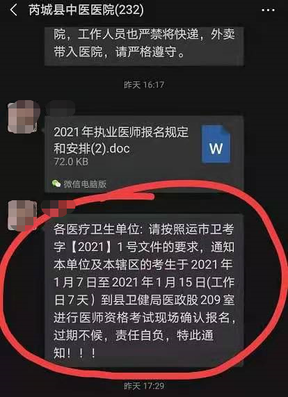 考生注意!這個地區(qū)2021年臨床執(zhí)業(yè)醫(yī)師現(xiàn)場審核已經(jīng)開始!根據(jù)國家衛(wèi)生健康委員會發(fā)布的《醫(yī)師資格考試委員會公告2020年第3號》,網(wǎng)上報名時間為2021年1月6日至2021年1月21日24時,現(xiàn)場審核時間為2021年1月25日至2021年2月8日。但近期山西省各報名點(diǎn)發(fā)布的現(xiàn)場審核通知中,很多地區(qū)現(xiàn)場審核已經(jīng)開始了,具體通知內(nèi)容醫(yī)學(xué)教育網(wǎng)小編搜集整理如下: