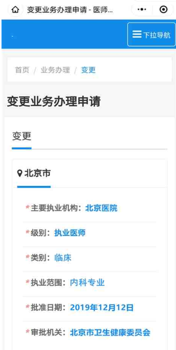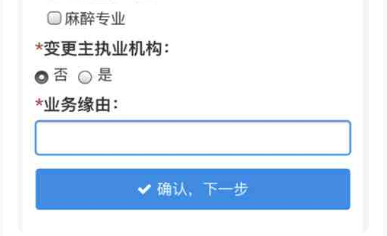 4、填寫業(yè)務(wù)信息,變更執(zhí)業(yè)范圍請選擇“是“,選擇您變更后的執(zhí)業(yè)范圍,其他填寫信息按照您的實際情況填寫。填寫完成后,點擊“確認,下一步”