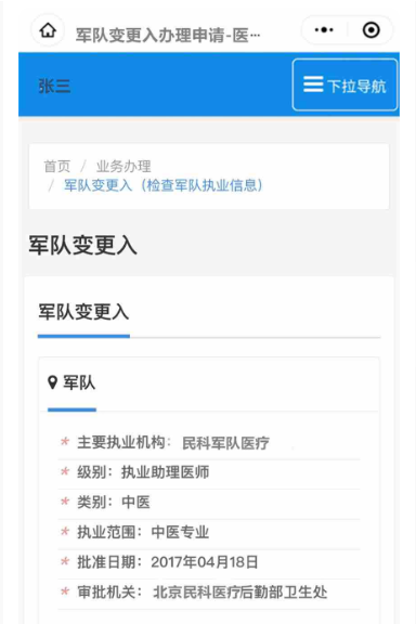 3、在右上角【下拉導(dǎo)航】中的【業(yè)務(wù)申請(qǐng)】中選擇“軍隊(duì)變更入”申請(qǐng)“點(diǎn)擊進(jìn)入“