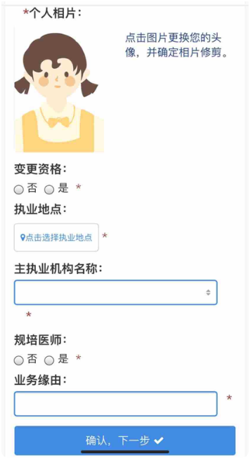 4、然后填寫(xiě)業(yè)務(wù)信息,選擇執(zhí)業(yè)地點(diǎn)(助理醫(yī)師的執(zhí)業(yè)地點(diǎn)是區(qū)縣級(jí)行政區(qū)劃;執(zhí)業(yè)醫(yī)師的執(zhí)業(yè)地點(diǎn)是省級(jí)行政區(qū)劃),其他信息按照您的實(shí)際情況填寫(xiě)。填寫(xiě)完成后,點(diǎn)擊“確認(rèn),下一步”