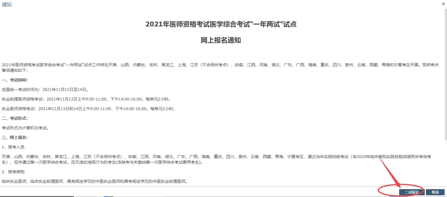仔細(xì)閱讀彈出的通知,點(diǎn)擊右下角“二試報(bào)名”