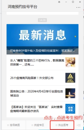 1.進入河南預(yù)約掛號平臺微信公眾號(或者網(wǎng)址http://phy.precare.cn/front/vueindex,使用微信客戶端打開),點擊執(zhí)業(yè)醫(yī)考-考生預(yù)約。填寫信息,登錄