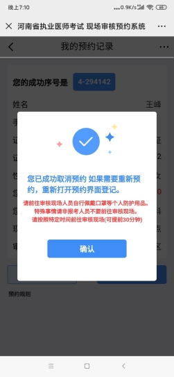 1.考生預(yù)約成功后,點擊預(yù)約成功頁的確認按鈕,可看到預(yù)約記錄。