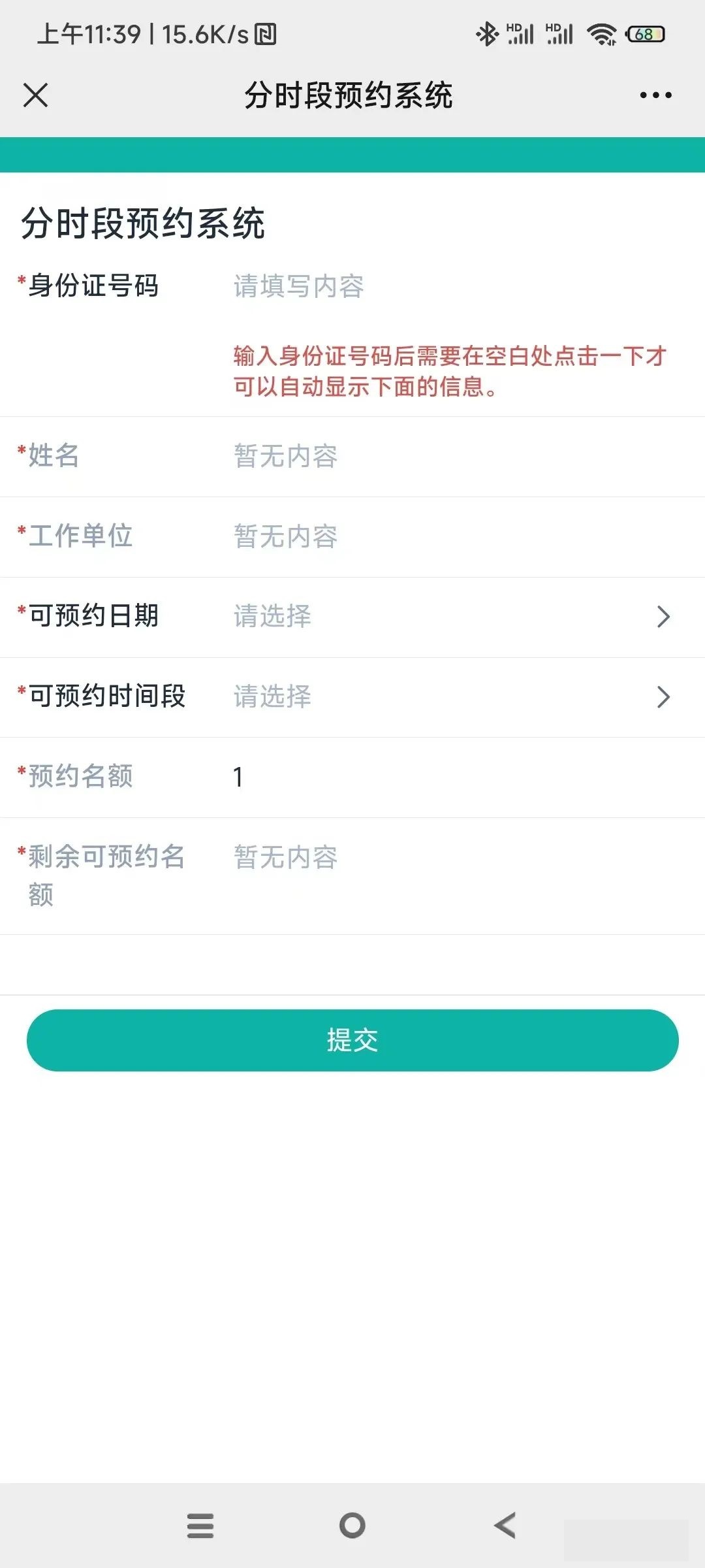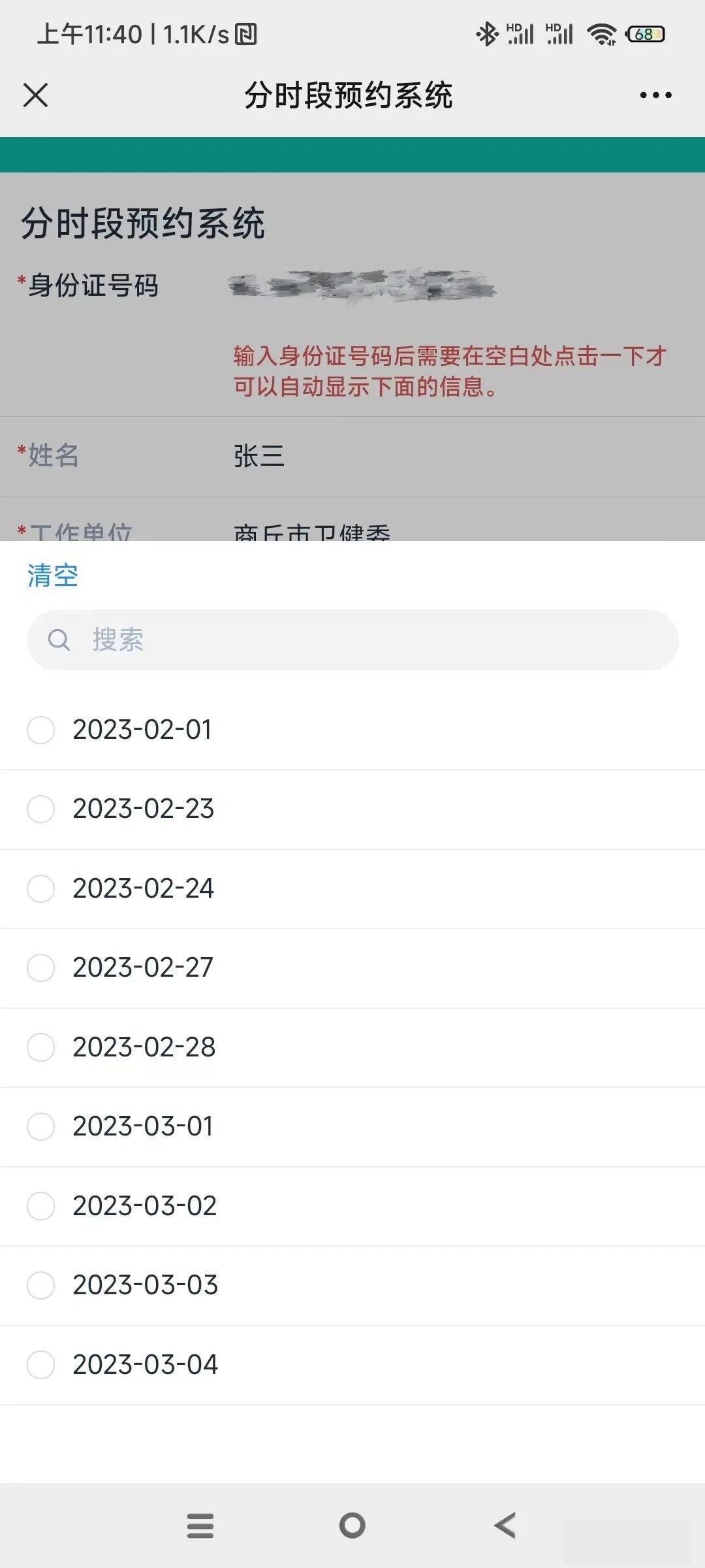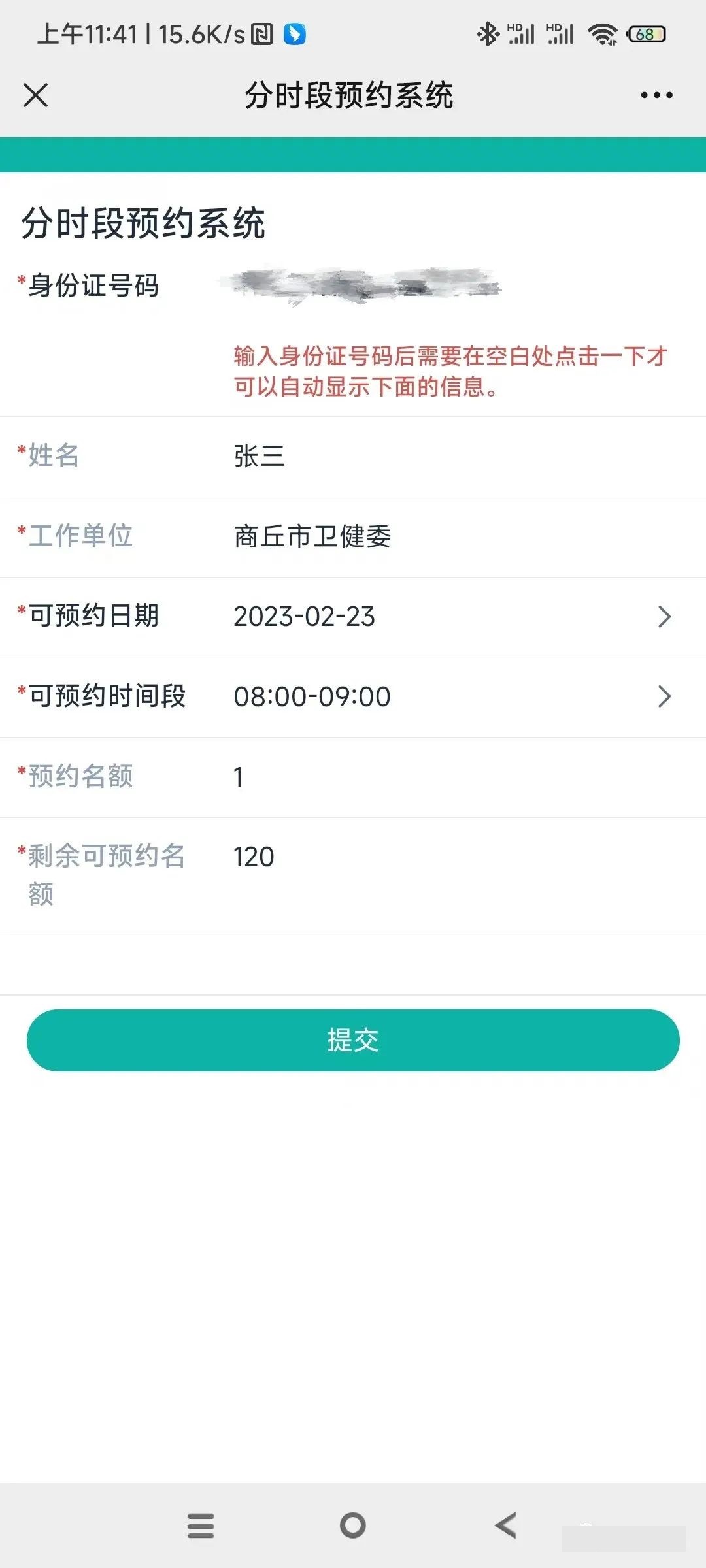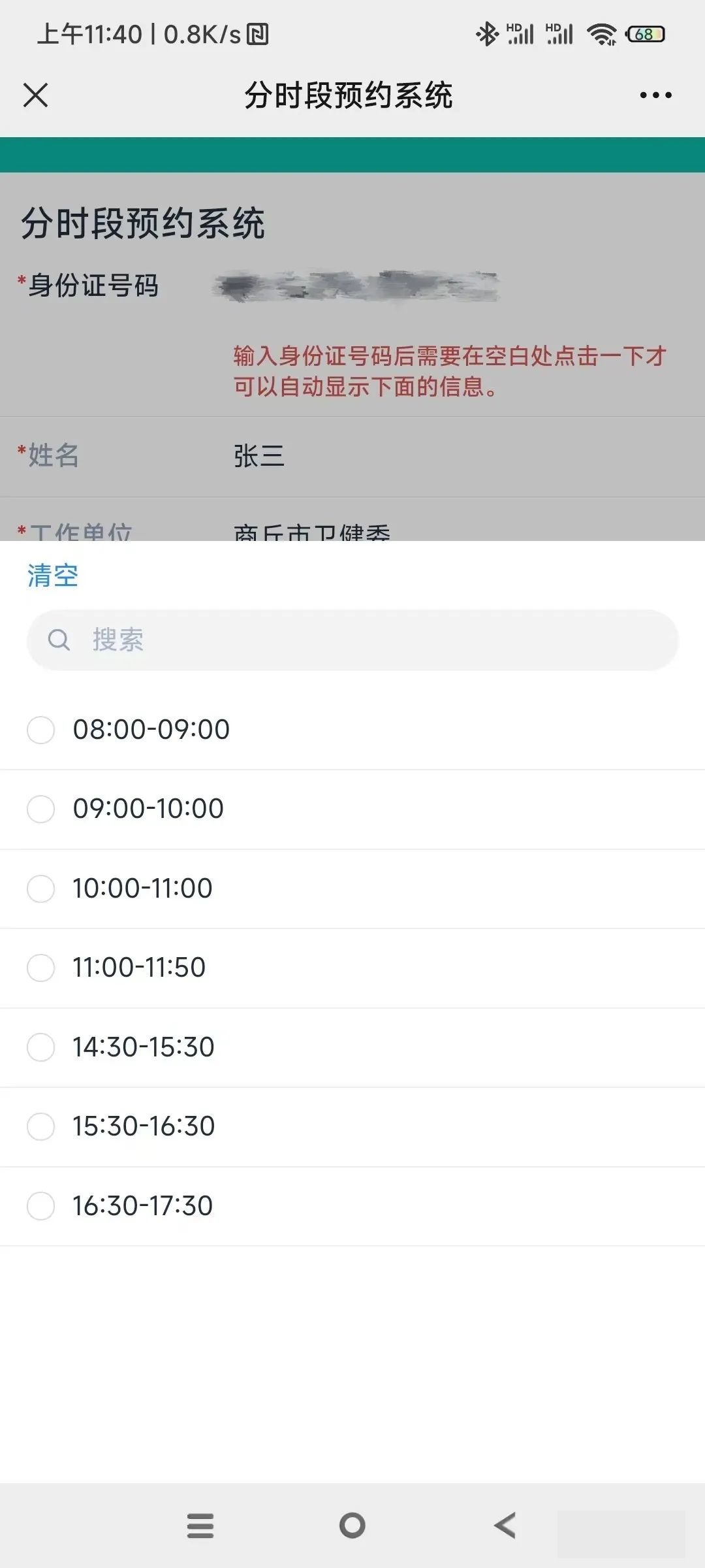 進入預約系統后輸入正確的身份證號碼(最后一位為字母的應為大寫)在空白處點擊一下,即可自動顯示您的姓名和工作單位信息,這個時候,您點擊可預約日期選擇需要預約的日期后再點擊可預約時間段,選擇您需要預約的時間段。