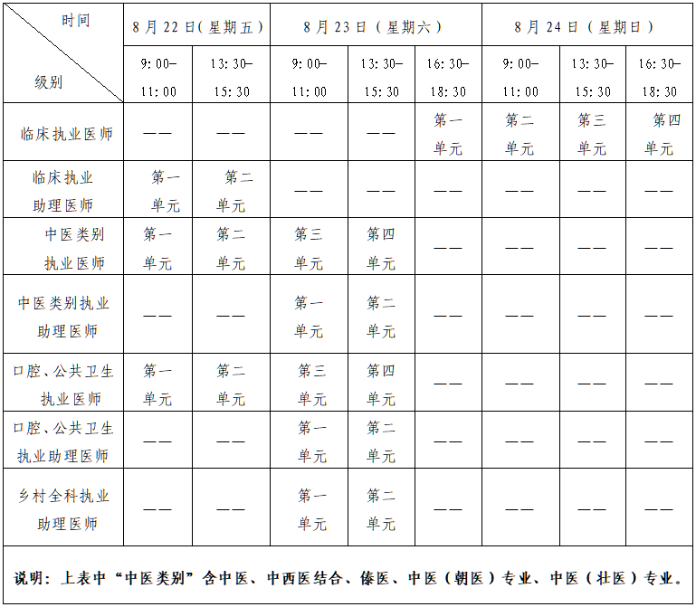 考試實行計算機(jī)化考試,軍隊現(xiàn)役人員加試軍事醫(yī)學(xué)、院前急救崗位和兒科專業(yè)加試相應(yīng)內(nèi)容。統(tǒng)一考試時間如下: