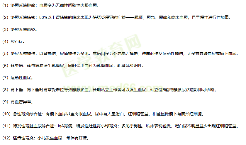 (13)急性非感染性腎小管間質性腎炎:可發(fā)生鏡下血尿以至肉眼血尿,無畸形紅細胞,有時可見嗜酸性紅細胞。