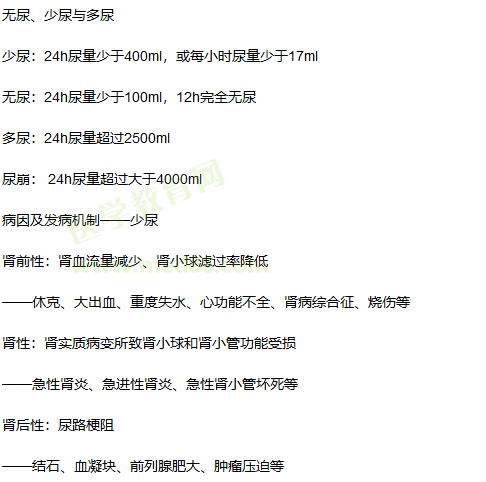 重點(diǎn)是掌握無尿、少尿與多尿各自的數(shù)值,一般題干多會告知患者是無尿、少尿與多尿所以此部分知識點(diǎn)還是比較簡單的醫(yī)學(xué)|教育網(wǎng)。