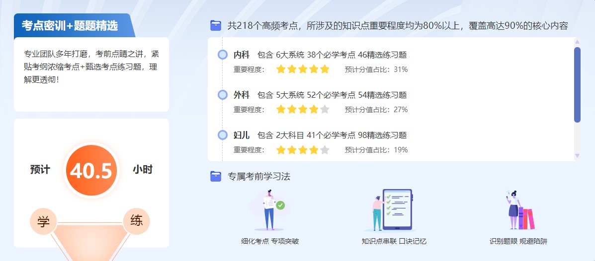 以上就是醫(yī)學(xué)教育網(wǎng)小編整理的歷年臨床助理醫(yī)師考試各系統(tǒng)高頻考點集錦,希望對各位2022臨床助理醫(yī)師考生沖刺備考有所幫助!想要利用好剩余的20多天加速沖刺,快來加入考前密訓(xùn)班!精選明星講師團全程直播,專攻高頻考點,緊貼考綱!點撥做題規(guī)律,模擬實戰(zhàn),掌握應(yīng)試技巧!