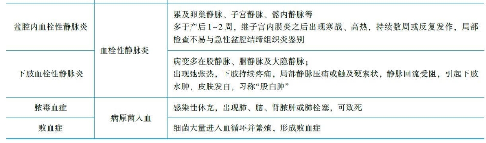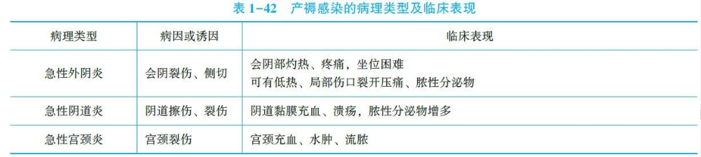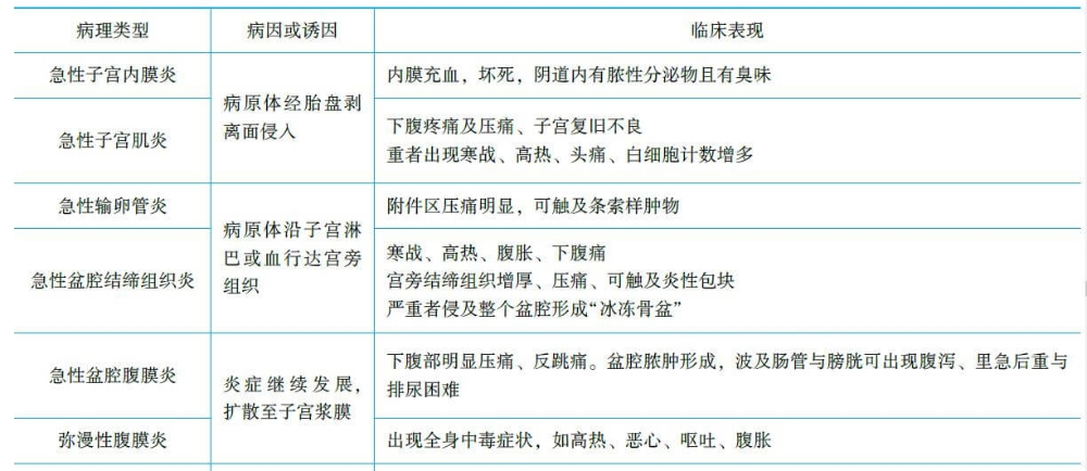 發(fā)熱、疼痛、異常惡露為產(chǎn)褥感染三大主要癥狀。按感染部位分為下表的類型。