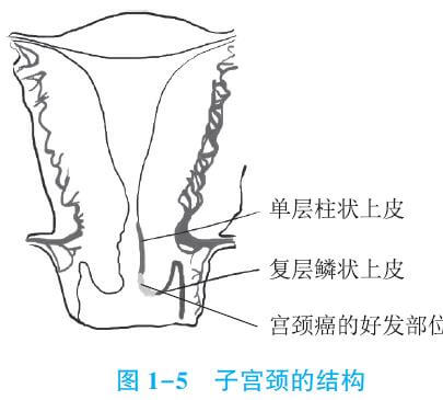 (2)宮頸:主要由致密的結(jié)締組織組成。宮頸管黏膜上皮細(xì)胞呈為高柱狀,黏膜內(nèi)有許多腺體,可分泌堿性黏液,形成黏液栓堵塞宮頸管。宮頸陰道部的上皮為復(fù)層鱗狀上皮,表面光滑。鱗狀上皮與宮頸管的柱狀上皮在宮頸外口處相交接,是宮頸癌的好發(fā)部位。宮頸黏液的性狀受性激素影響,發(fā)生周期性變化。