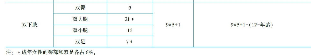 (2)手掌法:不論性別、年齡,患者并指的掌面約占體表面積1%,如醫(yī)者的手掌大小與患者相近,可用醫(yī)者手掌估算,此法可輔助九分法,尤其測算小面積燒傷較便捷。