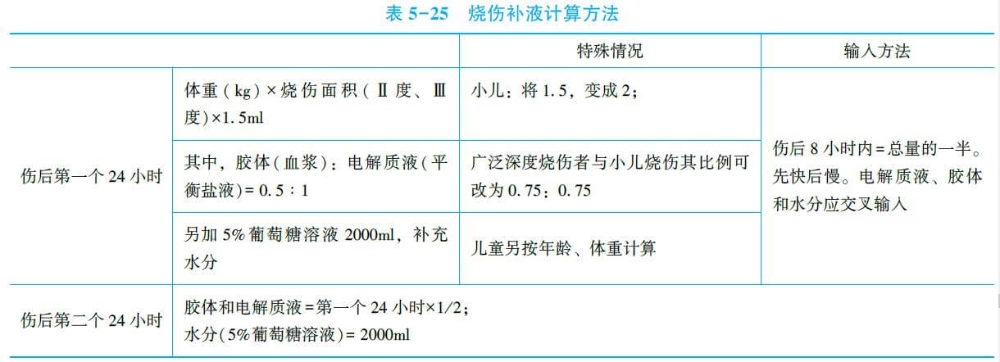 舉例:一燒傷面積60%、體重50kg患者,第一個24小時補液總量為60×50×1.5+2000=6500ml,其中膠體為60×50×0.5=1500ml,電解質(zhì)液為60×50×l=3000ml,水分為2000ml。第二個24小時,膠體減半為750ml,電解質(zhì)液減半為1500ml,水分仍為2000ml。