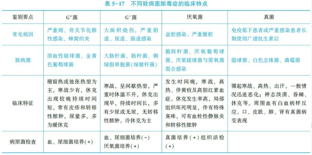 2.不同致病菌所致膿毒癥的臨床表現(xiàn)見下表。