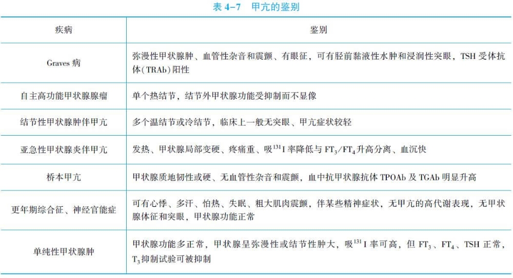 2.甲亢的病因診斷和鑒別診斷 在明確有甲狀腺毒癥表現(xiàn)、甲狀腺激素分泌過(guò)多后,要區(qū)分甲亢和甲狀腺自身功能正常的甲狀腺毒癥,以及區(qū)分甲亢的原因。