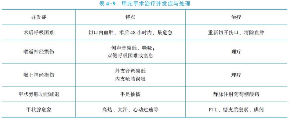 (5)甲狀腺危象:多發(fā)生于術(shù)后36小時以內(nèi),病情兇險。表現(xiàn)為高熱(>39℃)、脈速(>120次/分)、大汗、煩躁、昏迷。發(fā)生前可用靜脈滴注碘劑預(yù)防,發(fā)生后繼續(xù)用碘劑、鎮(zhèn)靜劑、氫化可的松、降溫治療。