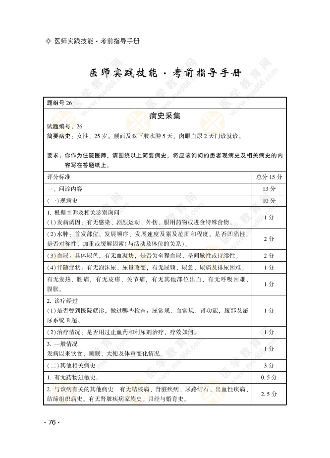 【病史采集26號習(xí)題】女性,25歲。顏面及雙下肢水腫5天,肉眼血尿2天門診就診!具體內(nèi)容醫(yī)學(xué)教育網(wǎng)編輯整理分享如下,希望對正在備戰(zhàn)2022年醫(yī)師實踐技能考試的考生有所幫助!