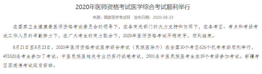 2020年醫(yī)師資格考試人數再創(chuàng)新低!筆試通過率會提升嗎?國家醫(yī)考中心發(fā)布信息:2020年醫(yī)師資格考試醫(yī)學綜合考試(民族醫(yī)除外)順利舉行,共493320名考生參加了考試。中醫(yī)民族醫(yī)相關專業(yè)仍實行紙筆考試,2901名中醫(yī)民族醫(yī)考生在39個考場參加考試。新疆考區(qū)因疫情考試延后安排,新疆最新筆試考試時間安排通知>>