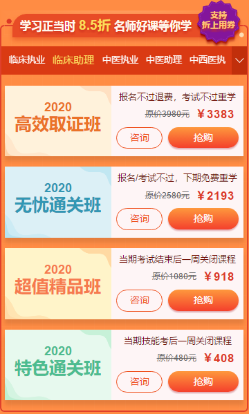 2019年臨床執(zhí)業(yè)助理醫(yī)師成績公布,也就是說2019年臨床執(zhí)業(yè)助理醫(yī)師考試告一段落,2020年臨床執(zhí)業(yè)助理醫(yī)師考試備考正式開啟!同樣,醫(yī)學教育網(wǎng)為大家送來2020年臨床執(zhí)業(yè)助理醫(yī)師的優(yōu)惠課程,請查收!