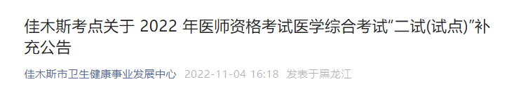 佳木斯考點(diǎn)關(guān)于 2022 年醫(yī)師資格考試醫(yī)學(xué)綜合考試“二試(試點(diǎn))”補(bǔ)充公告