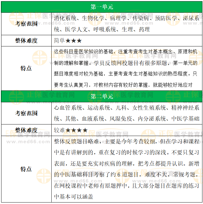 2.與2024年相比,各單元考試科目范圍基本保持一致:第一單元繼續(xù)以基礎(chǔ)醫(yī)學(xué)、預(yù)防醫(yī)學(xué)、醫(yī)學(xué)人文等記憶類題目為主,第二單元主要考察臨床醫(yī)學(xué)與中醫(yī)基礎(chǔ)部分。需注意的是,單元間科目劃分并非絕對(duì),存在交叉情況,例如消化、泌尿、傳染病等臨床科目?jī)?nèi)容,也會(huì)少量出現(xiàn)在第一單元中。此外,今年中醫(yī)題目難度依然不高,據(jù)考生反饋考查6道,基本各章節(jié)覆蓋1道,均為常見(jiàn)考點(diǎn)。