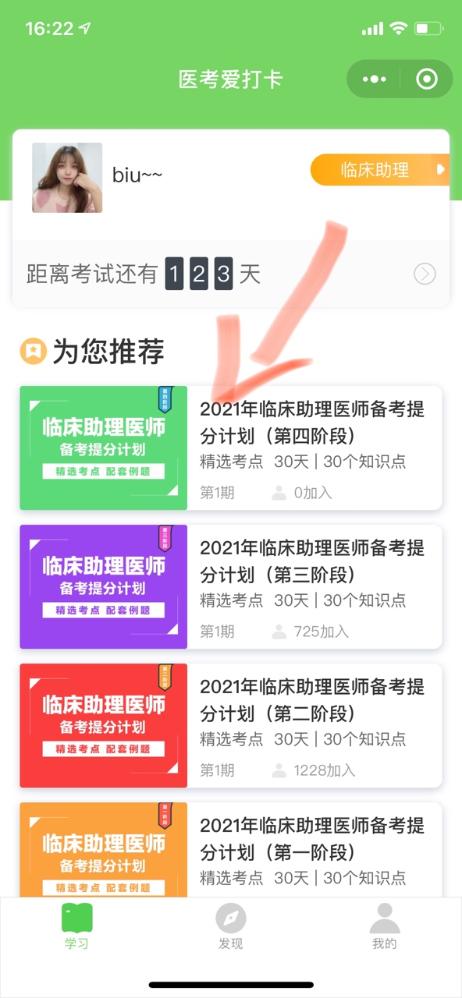 第三步:選擇備考科目后即進(jìn)入學(xué)習(xí)計(jì)劃選擇的頁(yè)面,請(qǐng)選擇“您的備考計(jì)劃”,如臨床助理醫(yī)師備考**計(jì)劃(第三階段),然后點(diǎn)擊下方“加入計(jì)劃 開(kāi)始學(xué)習(xí)”按鈕,開(kāi)始正式進(jìn)入打卡學(xué)習(xí)。