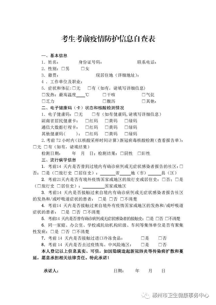 請在郴州考點參考的考生務(wù)必將《考生考前疫情防護信息自查表》填寫完整,并于考試當(dāng)天入場前交到防疫組相關(guān)工作人員手上,請各位考生相互轉(zhuǎn)告。