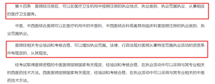 同時(shí)增加了兩條新規(guī)定:一是“醫(yī)師經(jīng)注冊(cè)后,可以在醫(yī)療衛(wèi)生機(jī)構(gòu)中按照注冊(cè)的執(zhí)業(yè)地點(diǎn)、執(zhí)業(yè)類別、執(zhí)業(yè)范圍執(zhí)業(yè),從事相應(yīng)的醫(yī)療衛(wèi)生服務(wù)”,二是“醫(yī)師經(jīng)相關(guān)專業(yè)培訓(xùn)和考核合格,可以增加執(zhí)業(yè)范圍”。