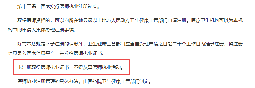 說(shuō)明:由上圖,與《執(zhí)業(yè)醫(yī)師法》對(duì)比,《醫(yī)師法》沿用了“醫(yī)師經(jīng)注冊(cè)后,可以在醫(yī)療衛(wèi)生機(jī)構(gòu)中按照注冊(cè)的執(zhí)業(yè)地點(diǎn)、執(zhí)業(yè)類別、執(zhí)業(yè)范圍執(zhí)業(yè),從事相應(yīng)的醫(yī)療衛(wèi)生服務(wù)工作。未經(jīng)醫(yī)師注冊(cè)取得執(zhí)業(yè)證書,不得從事醫(yī)師執(zhí)業(yè)活動(dòng)”規(guī)定。