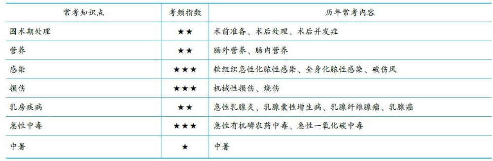其他這部分內(nèi)容比較雜,但考題不難,核心考點比較明確。最容易命題、最該重點掌握的得分點包括——乳腺疾病、燒傷、外科感染、中毒、圍手術(shù)期處理。